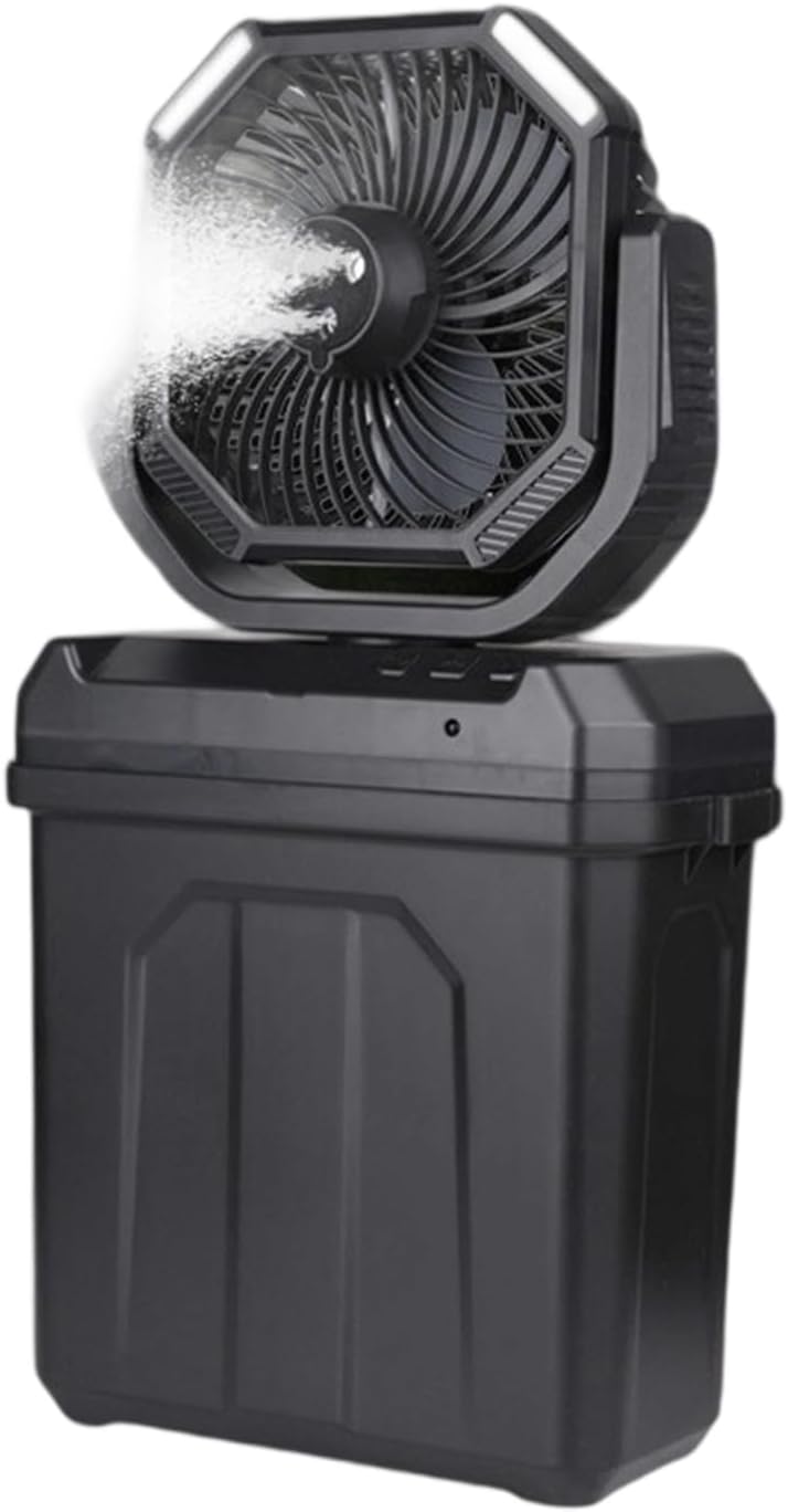 30000mAh Rechargeable Camping Misting Fan With Light Timer Fan With Hook 6L Bucket For Tent Garage Outdoor UseFeatures:Enjoy the flexibility of misting fan that allows you to direct quiet and powerful cooling from various angled. This feature ensures your tent stays cool and well-ventilated.Suitable for camping and other outdoor activity. This fan adapts to your comfort needs.This electric fan light is enough to fit easily into your bag, making it effortless travel. Its lightweight design ensures you can carry it without any extra burden, providing convenience for camping trip, picnics, or just moving around the house or office.Equipped with hook, this led light can be easily hanging in tents, or desk. The multifunctional allow for flexible placement, ensuring you can enjoy a refreshing wherever, whether home, office, or outdoors.Featuring LED light. for night reading, protecting your eye. This fan is essential for campers and anyone needing lighting during night activity.Specifications:Component Color Green/BlackBattery capacity: 30000mAhMotor Specifications:9V, 0.35A, 2500rpmInput: 5V/2APower: 10WCharging time: about 15hSize:Approx.24x13x46cm/18x5x9inchPackage Includes:1 Set Camping FanNote:1.Please allow 1-2cm errors due to manual measurement, making sure that you not mind before order. 2.Due to the differences between different monitors, the picture may not reflect the actual of the item.