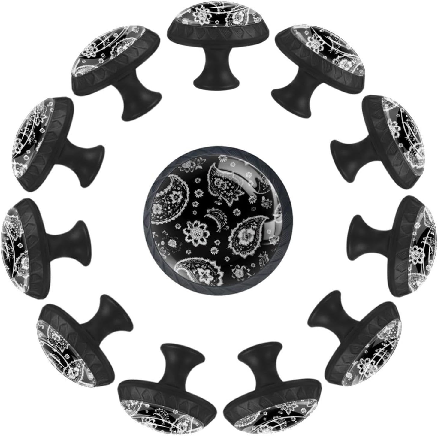 Black Patchwork Boho Paisley Floral (3) Drawer Pulls with Screws, Black Base Glass Knobs with Patchwork Boho Paisley Floral (3) Pattern