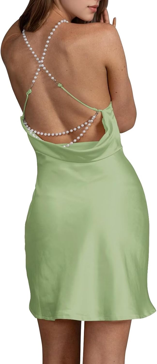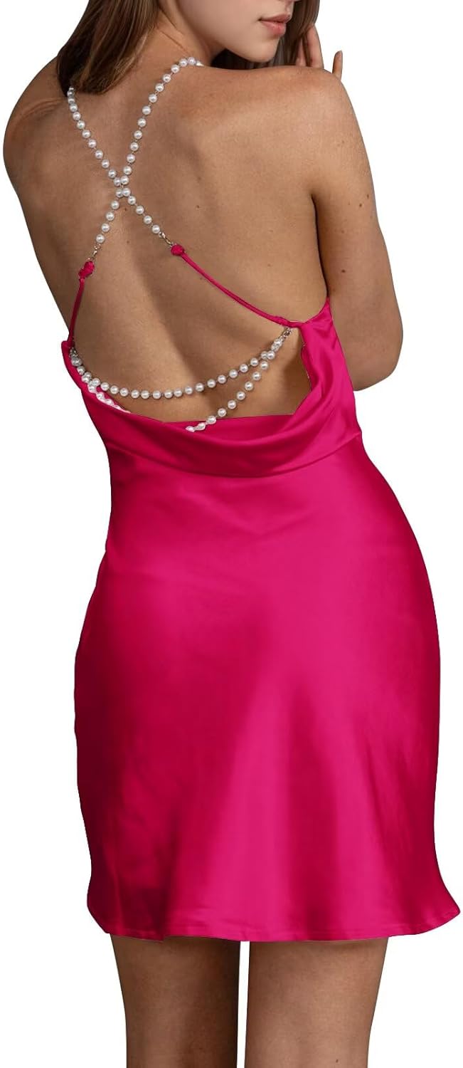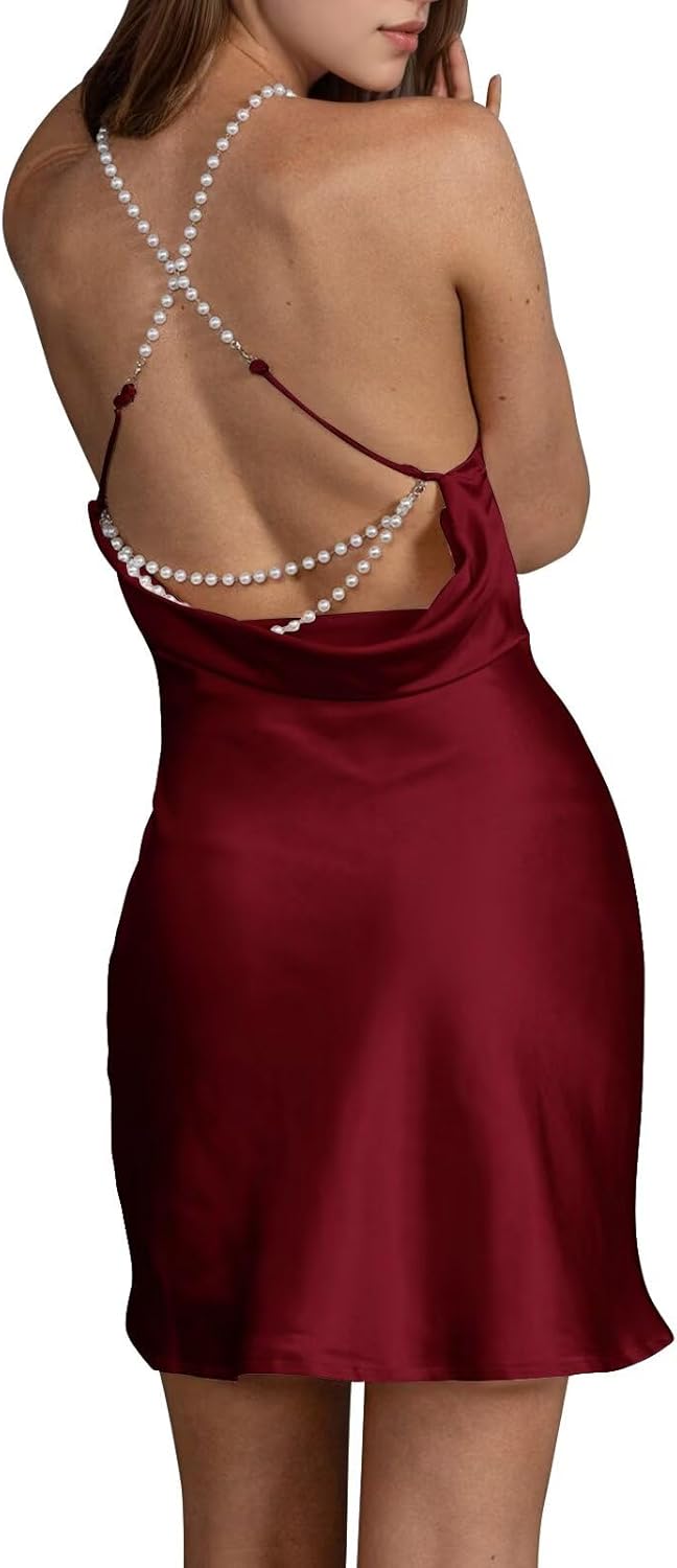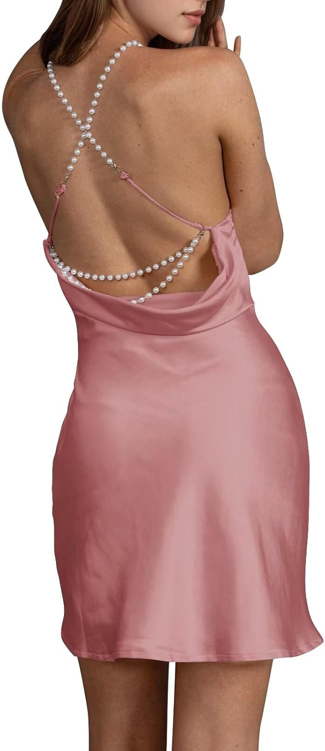 | Embellishment Feature | Dress with Pearl Bead for Women, HOCO Dress Open Back 2025, Mini Formal Cocktail Gowns, Satin Halter Homecoming Dress, Short Satin Graduation Party Dress |