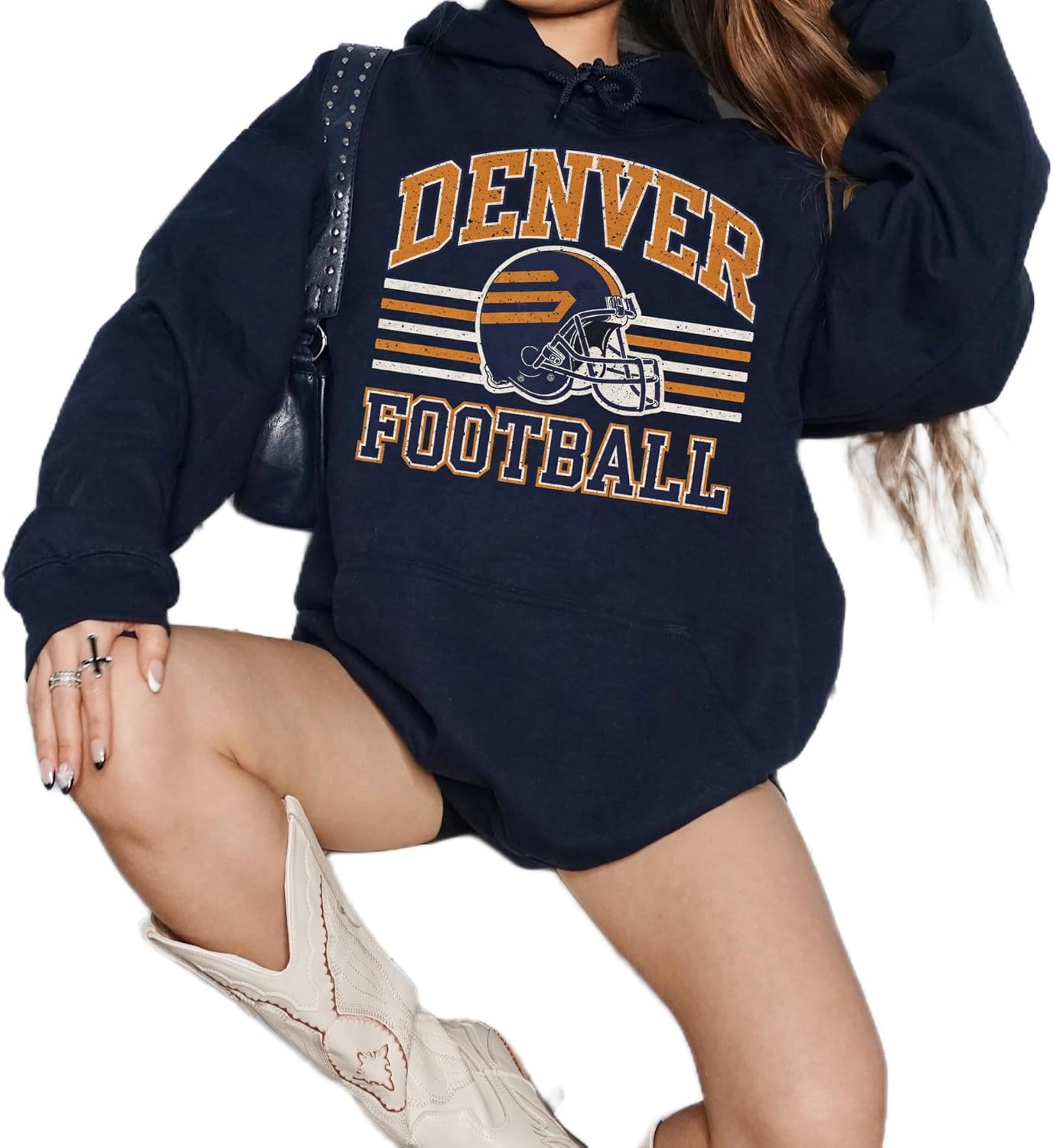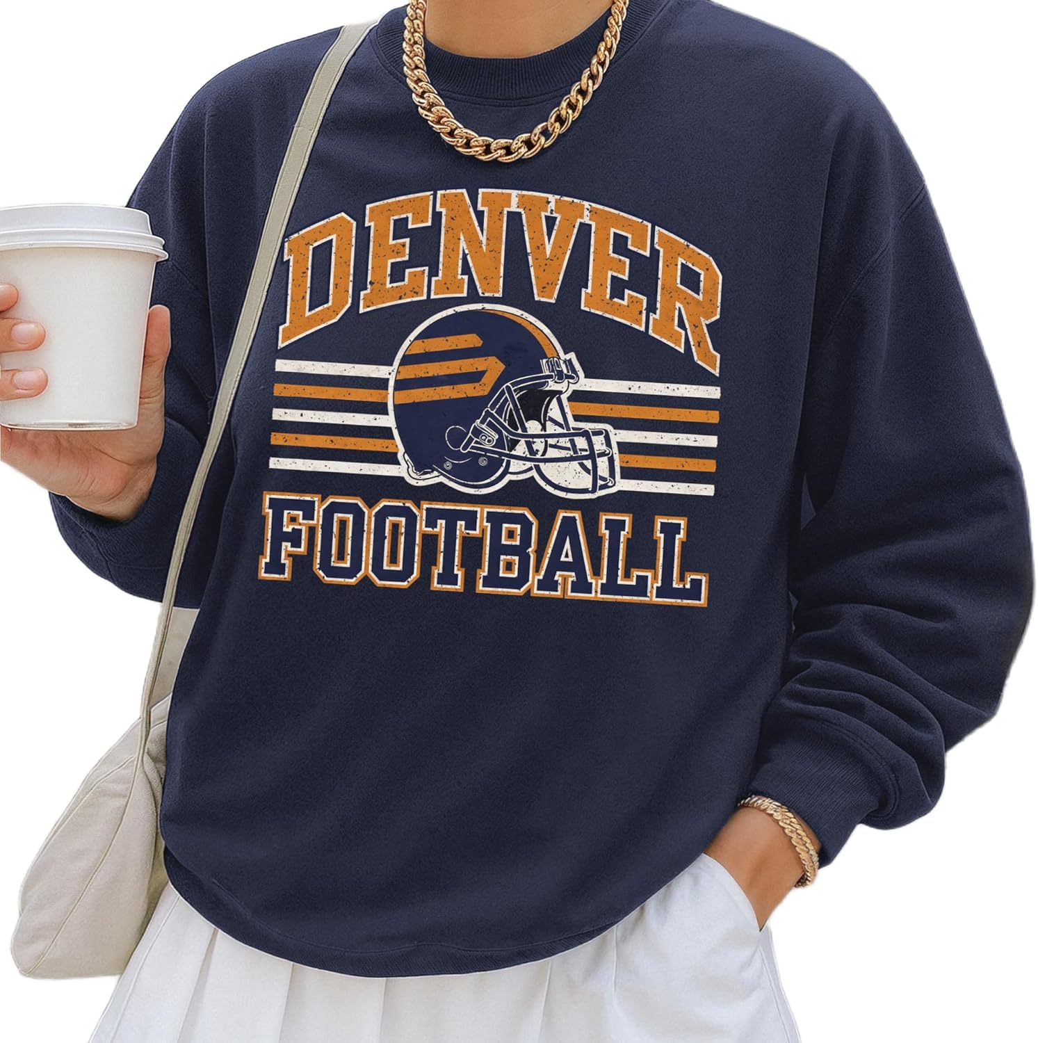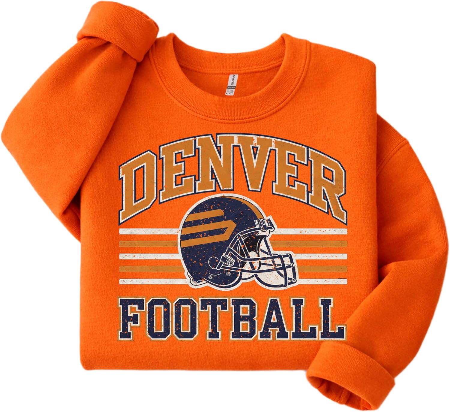 This distressed Denver football crewneck sweatshirt delivers a nostalgic varsity vibe with a worn-ink retro helmet design and classic stripe layout. Soft, cozy and easy to style with denim or leggings, it’s a comfortable pullover for relaxed weekends, casual hangouts, or cool weather layering. A vintage-inspired sport aesthetic for everyday wear.