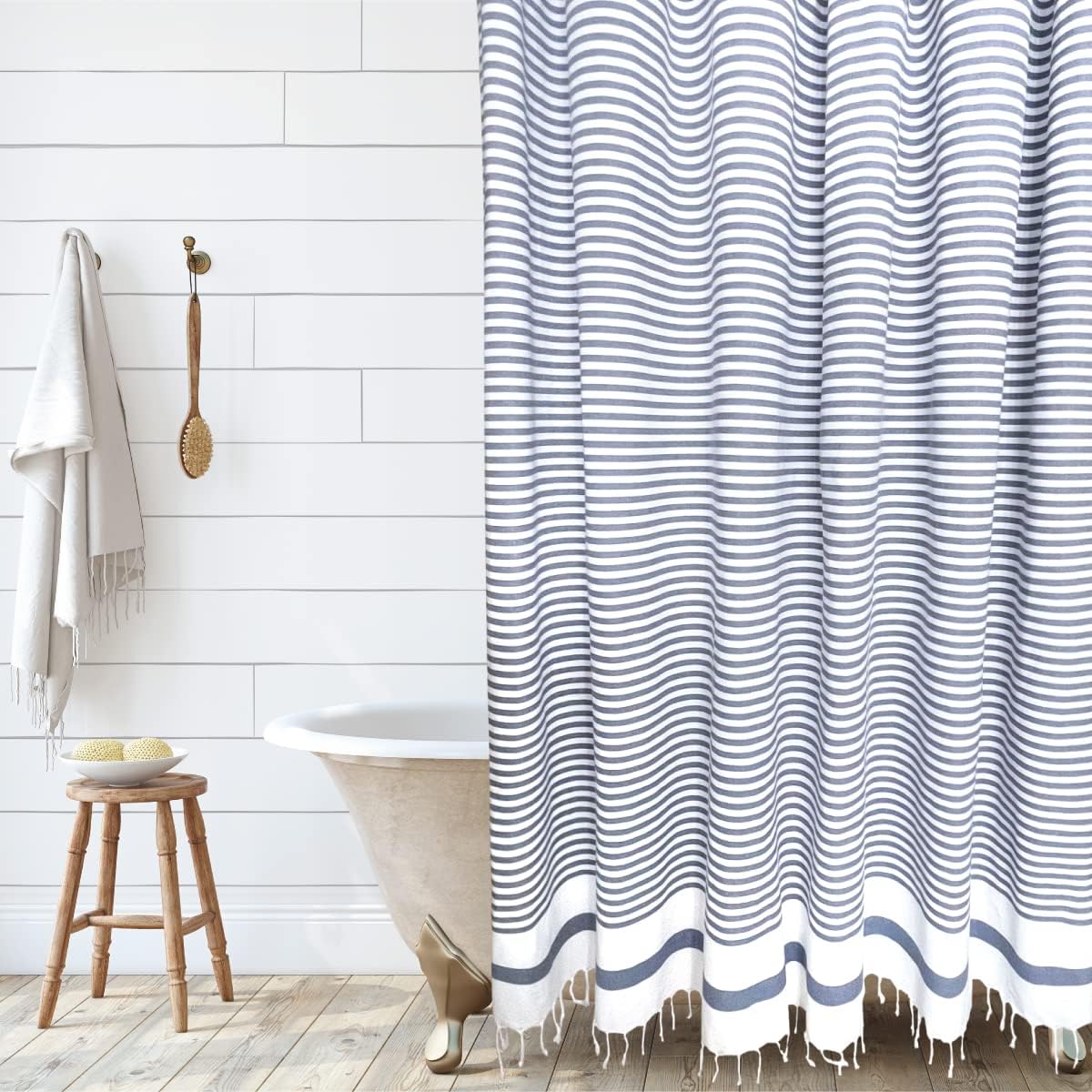 Update your bathroom space with our modern transitional collection of shower curtains from HOME by Hall & Perry. Our curtains are made with 100% cotton material. The fringed or tassel detailing on the bottom trim of the curtain enhances the visual appeal of our shower curtains, making them a stunning addition to your bathroom. All curtains come in a standard size of 72" x 72". We also offer a longer length of 72" x 84" on some of our legacy designs. Designed for a standard-size bathtub shower for use with an interior shower curtain liner (liner not included). Transform your bathroom with a fresh, new look with our variety of modern shower curtains.
